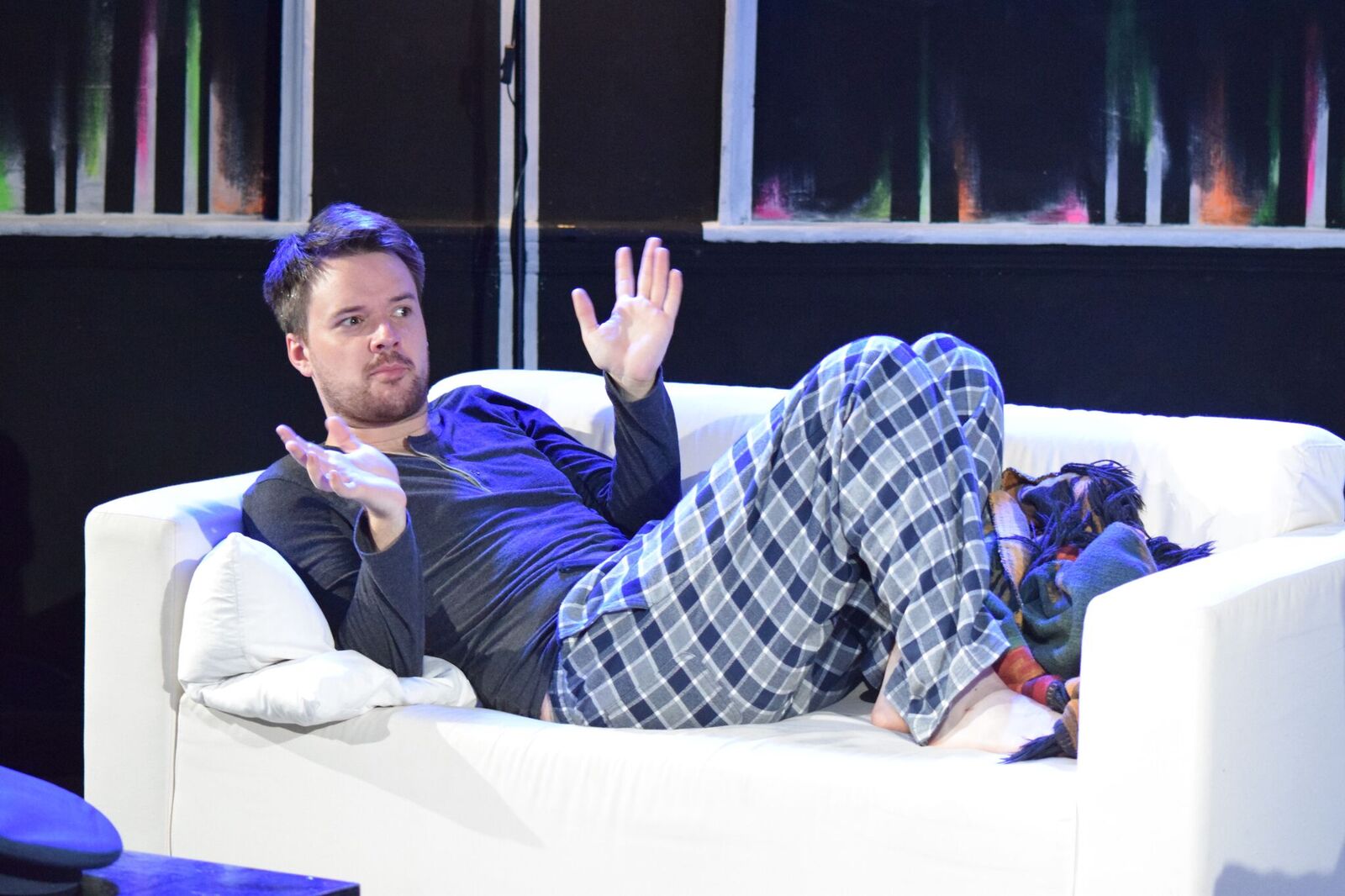 It opens with him complaining about the duck down pillow and brooding over his missing girlfriend. Soon he is visited by some strange men in his life. There is the overly camp Leo and the dull bus driver Vic. Then there is the mysterious lady Margot who likes to go out dancing.